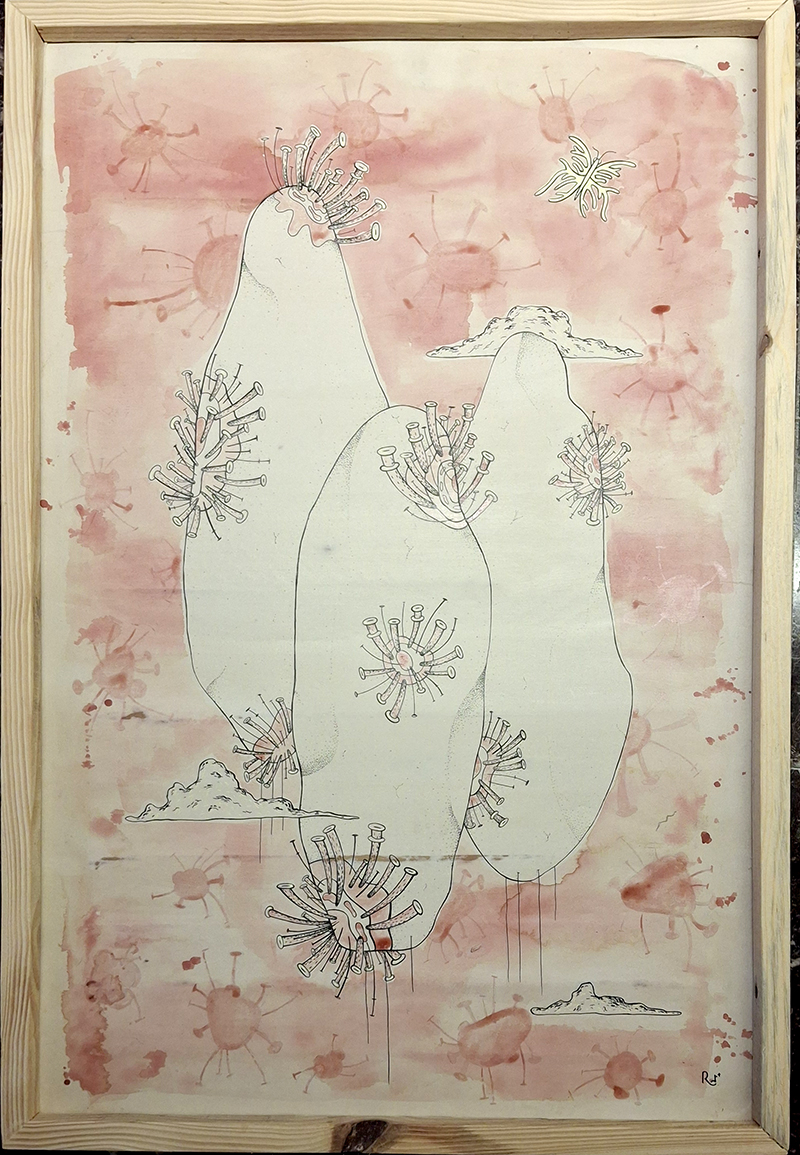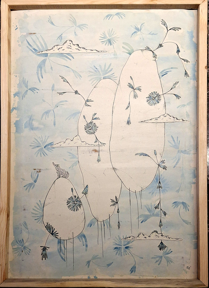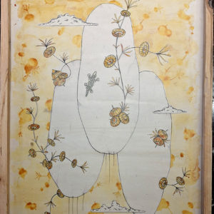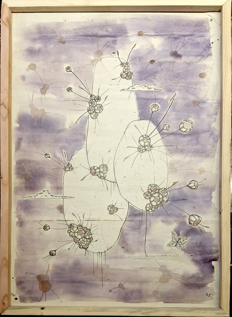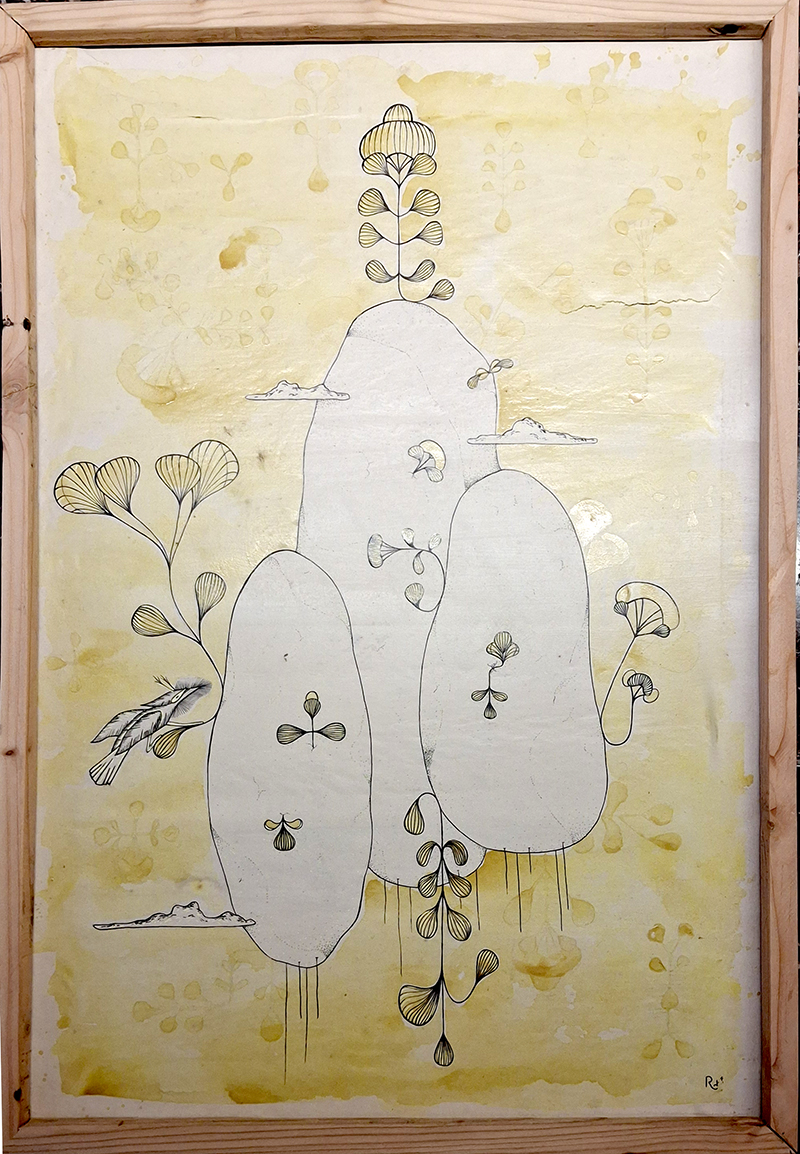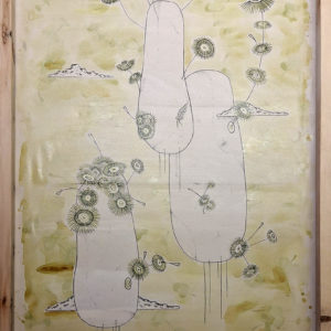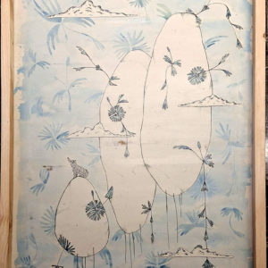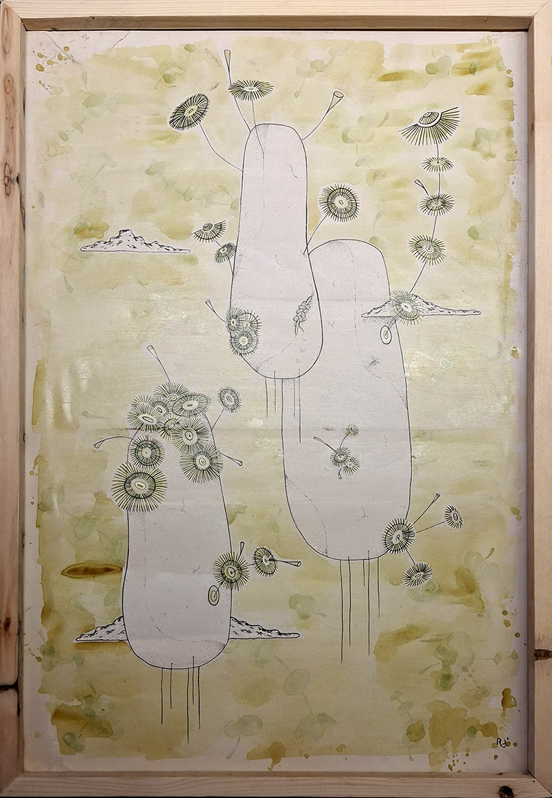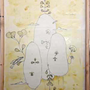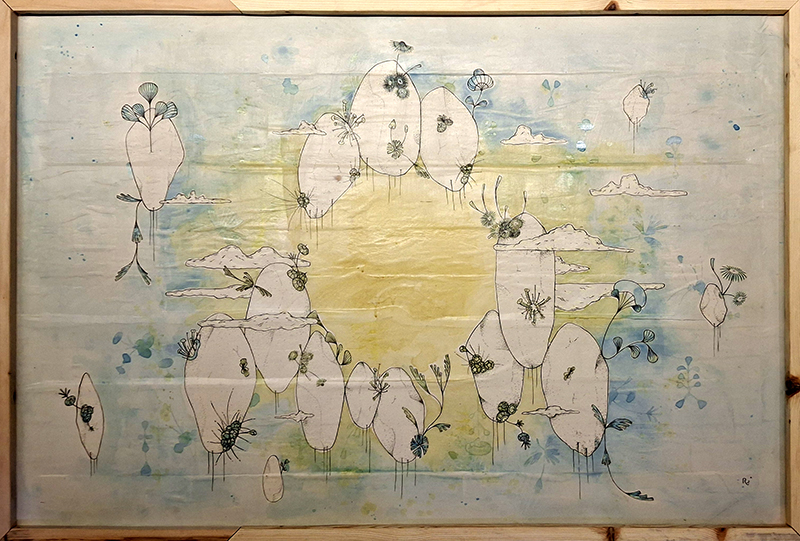 Réalisés à l’encre végétale, ces tableaux forment des îlots graphiques qui évoquent notre lien ambivalent à la nature : proche et lointain à la fois. Par leurs variations et hybridations, ils invitent à ralentir, observer et repenser notre manière d’habiter le monde.